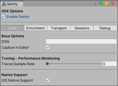 Sentry can be configured via the Sentry configuration window or programatically. The window can be accessed by going to Unity's top menu: Tools > Sentry.