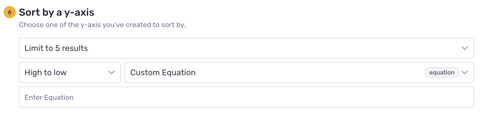 The option to sort by a y-axis is only available if you've applied a grouping to your data (in “Group your results”). The sorting applies to the underlying groups in your results and thus affects the series that appear in your chart. You can select fields that you used for grouping, select equations defined in the y-axes, construct any function similar to how you would select a function for plotting, or construct a custom equation.
