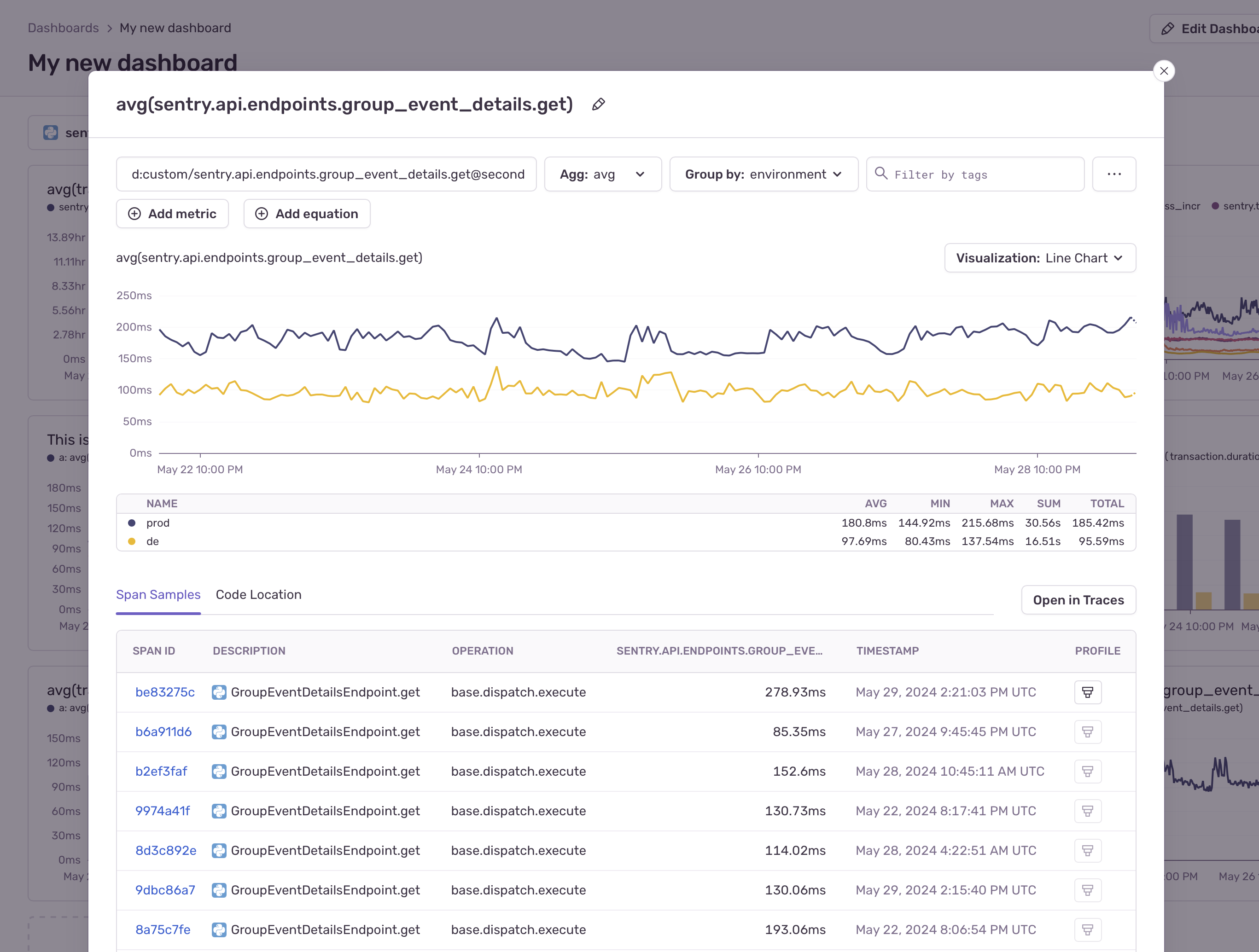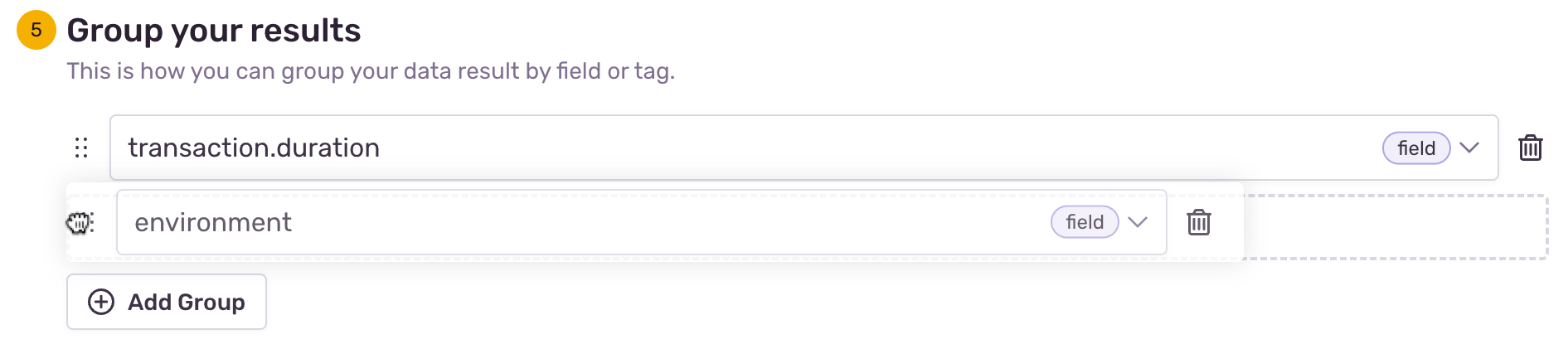 The option to group results is only available for time-series visualizations. You can group your time series results by different fields or tags such as project, environment, or transaction. You can select up to 20 fields to group your data.