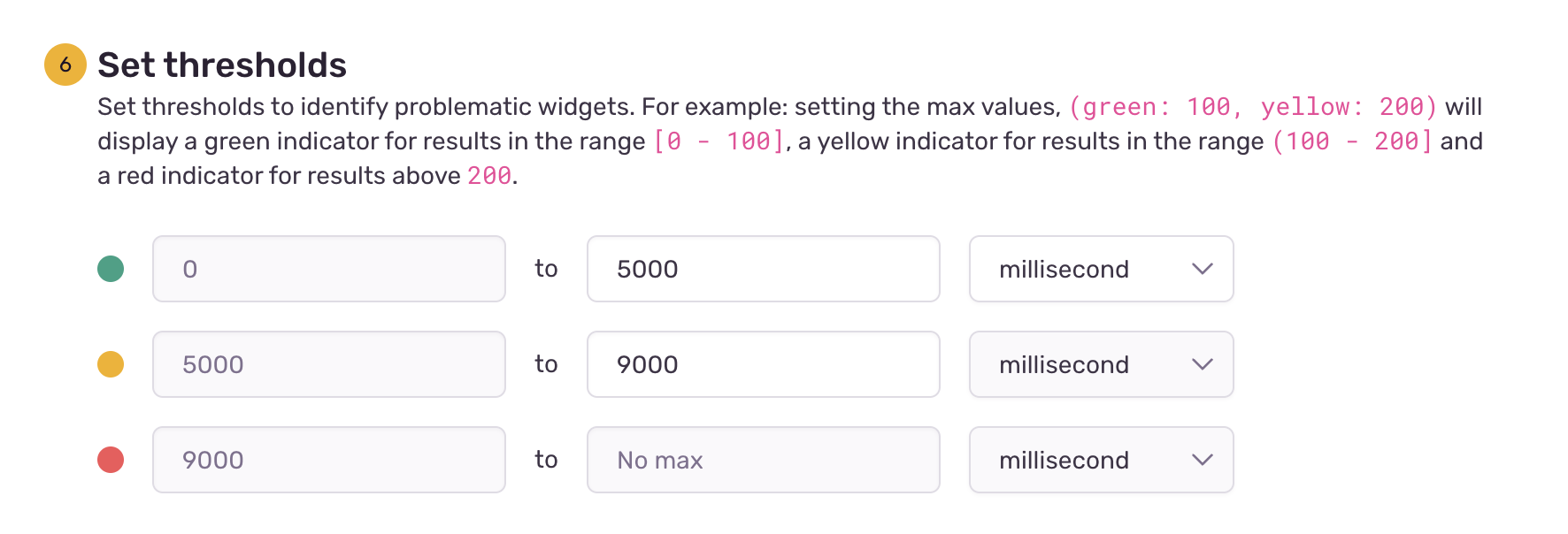 The option for setting thresholds is only available for big number visualizations. Thresholds help identify problematic widgets with colored indicators. Hovering over the colored indicators at the dashboard level displays the thresholds associated with a widget. Units can be attached to thresholds for duration or rate metric types. An example metric with units would be “p95 of all transactions”.