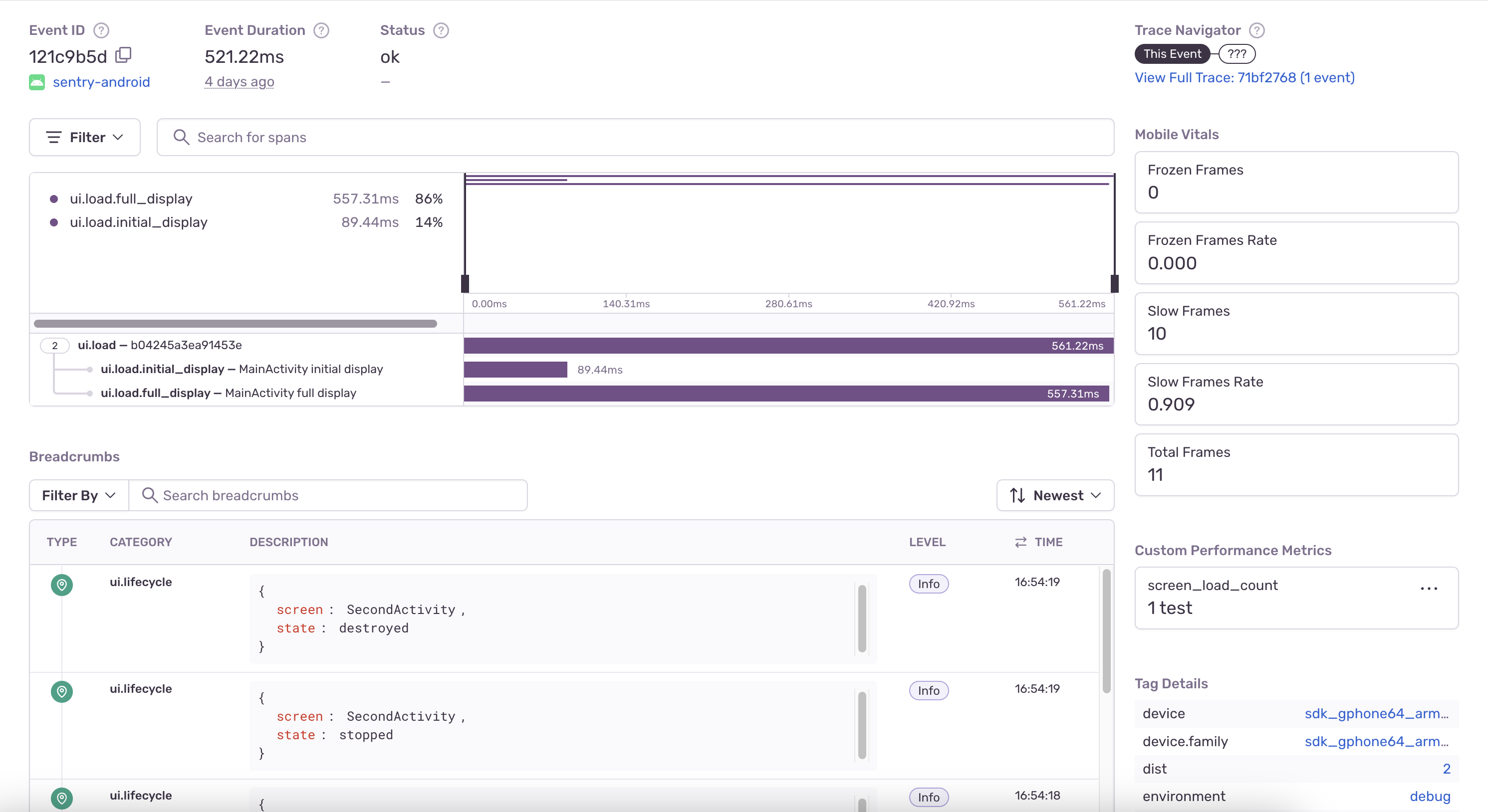 In the example below, the detail view of the transaction displays the time-to-initial-display span in an Android application: