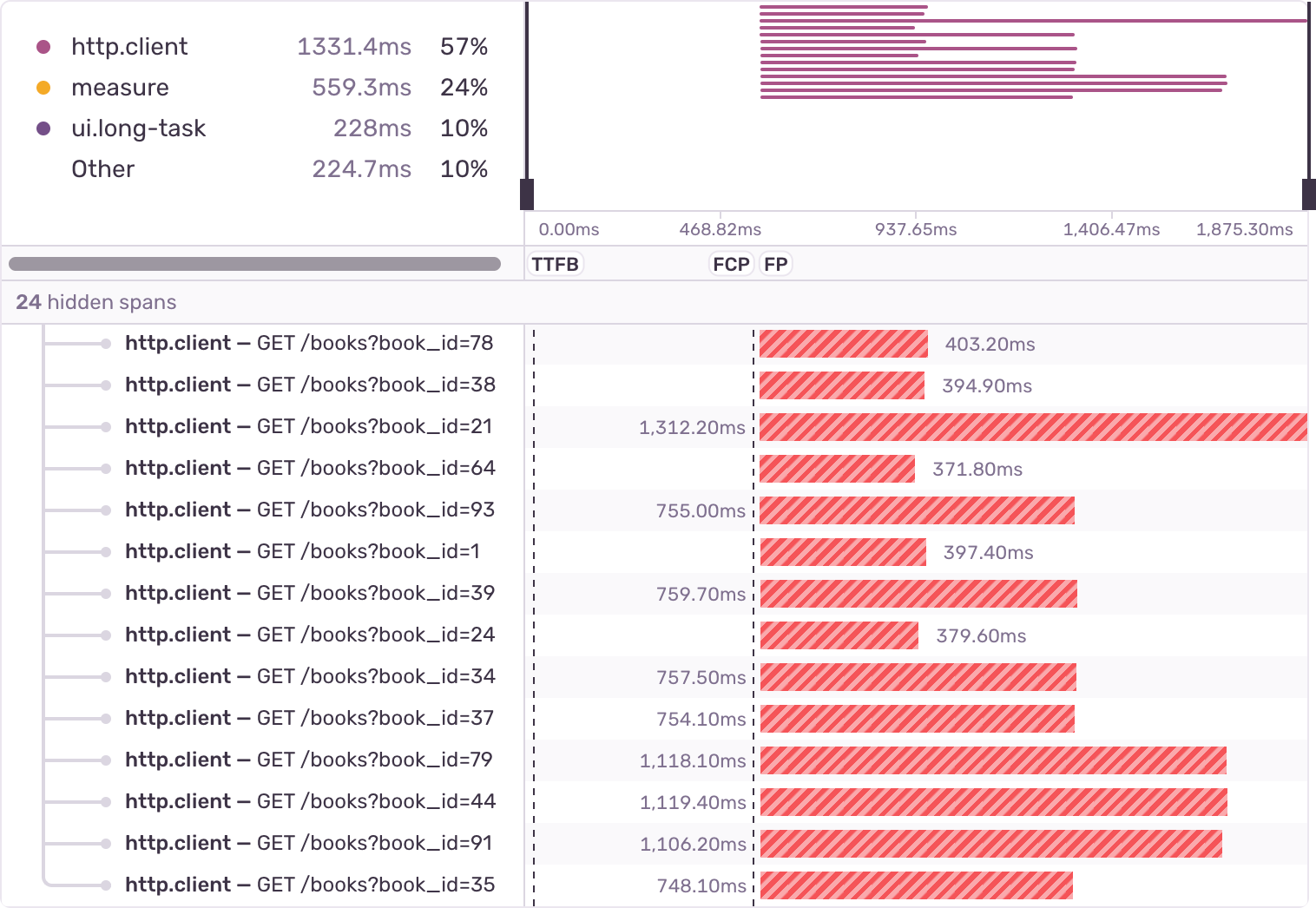 If the list has 100 books in it, the page will make 100 network calls simultaneously. The number 100 is the "N" in "N+1 API Call". This effect is visible in the span waterfall, which shows all the simultaneous network requests: