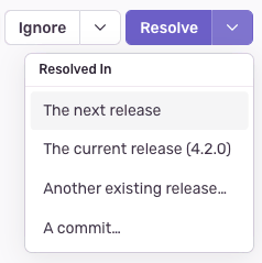 There are several options for resolving a release issue. If you'd like to leave the issue unresolved and be notified of it the next time any event is seen in a release, click the main "Resolve" button. But if you'd like to ignore the release issue until it's seen again in your current or next release, you can select "Resolved In The next release" or "Resolved In The current release" from the dropdown.